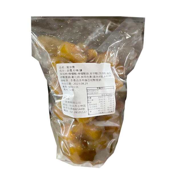 金棗.檸檬酸.檸檬酸鈉.苯甲酸(防腐劑)、偏亞 硫酸氫鈉.氯化鈣.食用色素(黃色4號、黃色5號